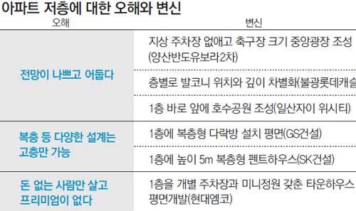 조경 특화로 저층의 조망권을 확보한 경남 ‘양산반도유보라2차’의 투시도. 반도건설 제공서울 송파구 잠실동의 주부 김모 씨(40)는 아파트 1층에서 살던 때만 생각하면 아직도 속상하다. 앞 동에 막혀 햇볕도 잘 들지 않았고 현관 옆이라 오가는 사람이 많다 보니 늘 시끄러웠다. 누가 들여다볼까 창문도 활짝 열 수 없었다. 김 씨는 “다른 층보다 훨씬 싸게 내놔도 집을 보러 오는 사람이 없어 다시는 1층에 살지 않겠다고 마음먹었다”고 말했다.