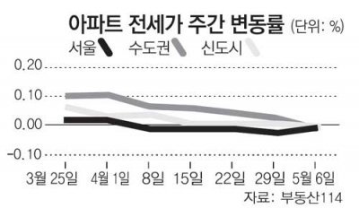 수도권 전세금이 40주 만에 떨어지면서 전세 시장이 안정세를 찾고 있다. 8일 부동산정보업체 부동산114에 따르면 지난주 아파트 전세 시세는 서울과 신도시가 0.01%, 수도권이 0.02% 각각 떨어졌다.