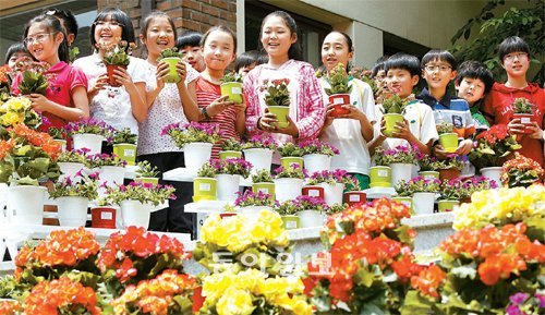 30일 서울 서대문구 미근동 미동초등학교 학생들이 자신이 키울 꽃을 받아들고 활짝 웃고 있다. 농림수산식품부와 농협, 한국화훼생산자협의회는 봄을 맞아 이날 서울 시내 초등학교 학생 10만 명에게 직접 기를 수 있는 꽃 화분을 전달했다.