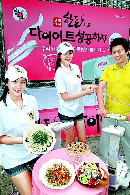 국산 돼지고기 소비 촉진 단체인 한돈자조금관리위원회가 11일 서울 종로구 세종로 동아미디어센터 앞에서 개최한 ‘우리 돼지 한돈으로 다이어트 성공하자’ 캠페인에서 모델들이 다양한 돼지고기 요리를 선보이고 있다.