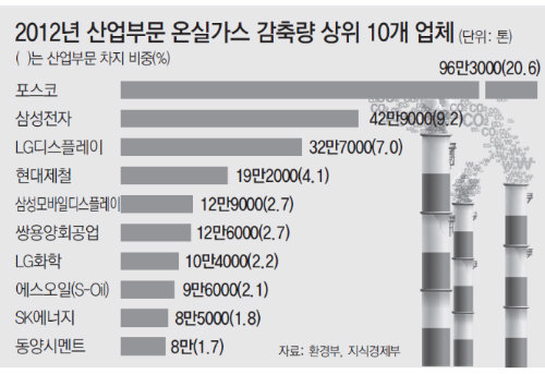 정부는 이날 발표에서 ‘현대자동차 몇 t, 르노삼성자동차 몇 t 감축’ 등 기업별 감축량은 대부분 공개하지 않았다. 감축 목표는 해당 기업의 생산량 정보를 기반으로 하기 때문에 기업 비밀에 해당돼 이같이 결정했다고 환경부는 설명했다. 다만 상징적 의미에서 감축량 상위 10개 업체(산업 부문)는 공개했다. 포스코 삼성전자 LG디스플레이 등 대기업 10곳이 줄여야 하는 온실가스는 250만 t으로 산업 부문 전체 감축량(470만 t)의 54.1%였다. 온실가스를 가장 많이 감축해야 하는 기업 1위는 포스코로 96만3000t이었다. 이어 삼성전자 42만9000t, LG디스플레이 32만7000t 순이었다. 이들 기업은 내년 1년 동안 온실가스를 줄인 결과를 2013년 3월까지 정부에 보고해야 한다.
