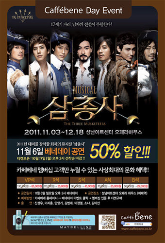 두 번째 베네데이 뮤지컬 <맘마미아>에 이어 내달 11월 6일, 세 번째 베네데이에 선정한 작품은 알렉상드르 뒤마의 동명 명작을 원작으로 한 작품 <삼총사>다.