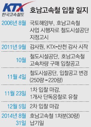 국토해양부는 2006년 총 사업비 10조5000억 원 규모의 호남고속철 사업시행자로 철도시설공단을 지정·고시했다. 철도시설공단은 2009년 12월 차량 설계를 시작해 2014년 개통한다는 계획을 수립했다. 하지만 사업 규모가 예상보다 축소되고, 이로 인한 사업 재조정 등으로 입찰이 계속 늦춰졌다. 국토부는 “예산 협의가 어려움을 겪으면서 당초 25편성(1편성은 10량)에서 22편성으로 조정됐다”며 “이를 사업자에게 재공고하고 새롭게 입찰을 시작하는 데 시간이 소요됐다”고 설명했다. 여기에 KTX-산천의 잦은 고장으로 감사원 감사까지 시작되면서 입찰이 미뤄졌다.