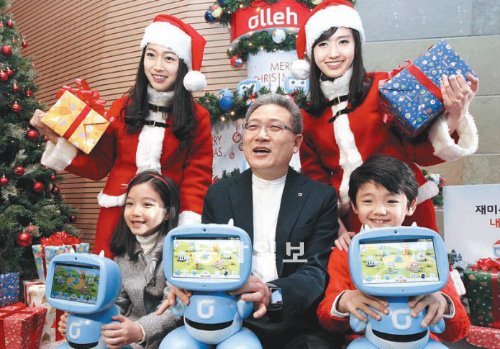 KT는 22일 서울 종로구 세종로 KT올레스퀘어에서 스마트 로봇 ‘키봇2’를 선보였다. 키봇2는 교육 콘텐츠와 멀티미디어 기능을 갖춰 영유아부터 초등학생까지 즐길 수 있는 것이 특징이다. 서유열 KT 홈고객부문 사장(가운데)이 키봇2를 들어 보이고 있다. 2년 약정으로 단말기와 서비스 요금을 포함해 월 4만4000원을 내면 된다.