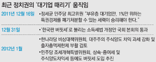 특히 최근 한나라당 비상대책위원회가 당 정강·정책에서 ‘보수’라는 표현을 삭제하는 것을 비롯해 ‘한국판 버핏세’라는 고소득자 증세 법안을 주도하는 등 ‘좌(左)클릭’ 행보를 보이는 데 대해 대기업들은 크게 우려하고 있다. 4월 19대 총선을 앞두고 한나라당이 정책 방향을 뒤집으면서 정권 말 각종 기업 규제정책이 쏟아지는 게 아니냐고 걱정하는 것이다.