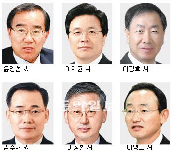 윤 교수(행정고시 23회)는 기획재정부 세제실장, 관세청장을 지냈으며 고향인 충남 보령-서천 지역구에 출마할 예정. 국토해양부 2차관을 지낸 이재균 회장(행시 23회)은 불출마를 선언한 김형오 전 국회의장 지역구인 부산 영도구 출마를 준비하고 있다. 지식경제부 우정사업정보센터장을 지낸 이강후 사장(행시 22회)은 9일 사장직에서 물러나 고향인 강원 원주시에서 총선 준비에 나설 계획이다.