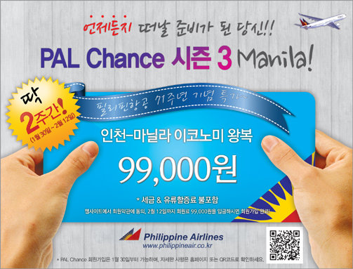 지난해 런칭, 상반기와 하반기 연2회만 출시하는 필리핀항공의 특별회원 팔 챈스(PAL Chance), 3차 회원가입이 오는 1월 30일부터 2월 12일까지 2주간 오픈된다. 인천-마닐라 이코노미 왕복항공권에 대한 회원가입비 99,000원을 선납입하면 출발3일전에 통보되는 여행일정에 따른 세금만 납부하면 이용가능하다.