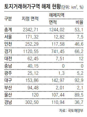 지역별로는 수도권에서 허가구역으로 지정된 면적의 56.5%가 풀렸다. 특히 경기도의 해제 면적이 넓은데, 용인·수원·부천·성남·안양 등지에서 지정면적의 66.2%인 741km²가 풀려났다. 인천도 전체의 절반(46.6%) 가까운 117.58km²가 해제됐다. 서울은 해제면적이 전체 허가구역의 7.5%(12.82km²)에 머물렀다. 지방에서는 대구시가 해제비율로 가장 큰 92.9%(142.97km²)가 해제됐고, 울산(비율 89.5%·면적 107.44km²) 경남(36.7%·110.94km²) 등도 대거 풀렸다.