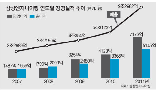 삼성엔지니어링은 지난해 매출 9조2982억 원, 영업이익 7173억 원, 순이익 5145억 원의 실적을 냈다고 30일 밝혔다. 2010년과 비교해 매출은 75%, 영업이익은 74% 오른 수치다.