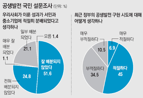 지난해 이명박 대통령이 내세운 ‘공생발전’ 정책에 대해서는 응답자의 절반 정도가 실효성이 없거나 방향이 잘못됐다고 지적했다. 응답자의 51.9%가 ‘매우 적절하다’거나 ‘적절하다’고 답했지만 45%는 ‘부적절하다’거나 ‘매우 부적절하다’고 답했다.