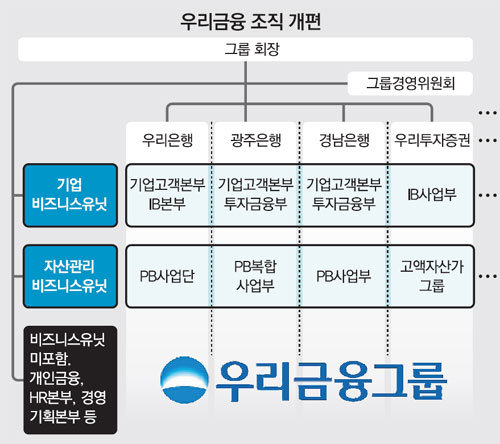 13일 우리금융의 조직개편안에 따르면 우리금융은 우리은행과 우리투자증권 경남은행 광주은행 등 각 계열사 기업금융본부와 자산관리본부가 포함된 그룹 차원의 리스크 감시조직을 신설할 계획이다. 예를 들어 우리은행의 PB사업단과 광주은행 경남은행의 PB사업부, 우리투자증권의 고액자산가(HNW)그룹 등 비슷한 분야를 하나로 엮어 지주사 안에 자산관리비즈니스유닛(BU)을 따로 만든다는 것이다. 또 각 계열사의 기업고객본부와 투자금융을 모아 기업BU를 세우는 식이다.