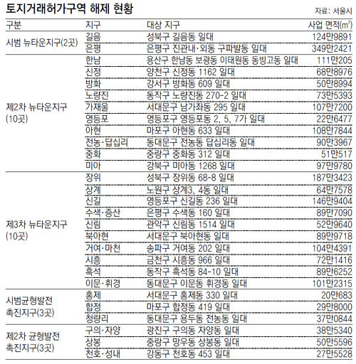 이번에 해제되는 구역은 △성북구 길음뉴타운 등 시범뉴타운 2개 지구 474만2312m²(약 143만7064평) △용산구 한남뉴타운 등 2차 뉴타운 10개 지구 782만9353m²(약 237만2531평) △성북구 장위뉴타운 등 3차 뉴타운 10개 지구 999만1227m²(약 302만7644평) △서대문구 홍제균형발전촉진지구 등 시범 균형발전촉진지구 3곳 86만9527m²(약 26만3493평) △광진구 구의·자양균형발전촉진지구 등 2차 균형발전촉진지구 3곳 116만6464m²(약 35만3473평)다.