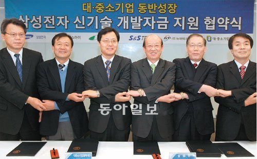 삼성전자는 이 같은 동반성장 모델에 따라 올해 1월 신기술 개발 공모제를 실시했다. 이는 기술과 아이디어가 있지만 돈이 부족해 고민하는 기업에 자금을 지원하고 차세대 기술을 공동으로 개발해 성과를 공유하는 제도다. 지난해 8월 공모를 거쳐 에스엔에스텍, 큐에스아이, 뉴파워플라즈마, 자화전자 등 4개사를 첫 지원 대상으로 뽑았다. 선정된 기업은 삼성전자와 공동으로 기술을 개발해 최대 10억 원을 무상으로 지원받게 된다.