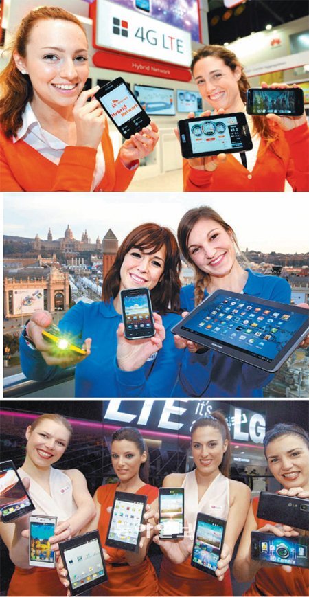 27일부터 스페인 바르셀로나에서 열리는 MWC에서 SK텔레콤 모델이 서로 다른 통신망을 하나로 써서 망 과부하 문제를 해결할 ‘하이브리드 네트워크 기술’이 표시된 스마트폰을 보여주고 있다(위), MWC에서 삼성전자 모델들이 빔 프로젝터 스마트폰인 갤럭시빔과 태블릿PC인 갤럭시탭2를 소개하고 있다(가운데), LG전자는 MWC에서 스마트폰 옵티머스 L7, 옵티머스뷰, 옵티머스 4X HD 등을 공개했다(아래).바르셀로나=사진공동취재단