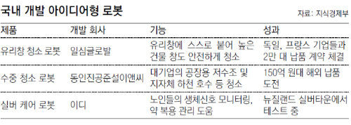 최근 국내에서 개발된 아이디어형 로봇들이 국내 및 해외 시장에서 호응을 얻고 있다. 고층건물 유리에 ‘척’ 하고 붙어 유리를 닦는 ‘유리창 청소 로봇’부터 노인들의 건강상태와 약 복용까지 챙기는 ‘실버 케어 로봇’ 등 흥미로운 개발품이 여럿이다.