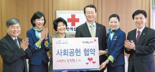 대한적십자사의 유중근 총재(왼쪽에서 세 번째)와 에어부산의 김수천 대표(왼쪽에서 네 번째)가 27일 서울 중구 남산동 대한적십자사 빌딩에서 ‘사랑의 동전 모으기’ 캠페인 협약을 맺었다.