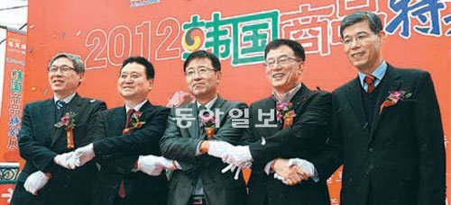 2일 중국 베이징 롯데마트 주셴차오(酒仙橋)점에서 열린 한국상품특별전 개막식에서 한상재 대청에프엔씨 대표, 손창록 중소기업유통센터 대표, 정윤모 중소기업청 중국 국장, 박종두 롯데마트 화북 본부장, 박진형 KOTRA 중국 본부장(왼쪽부터)이 손을 맞잡고 있다.