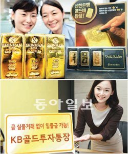 《국제 금값이 올해 들어 고공행진을 계속하면서 유망한 재테크 수단으로 다시 부상하고 있다. 현재 국제시장에서 금의 선물시세는 온스당 1700달러 선에 거래되고 있다. 시중은행들은 금에 투자할 수 있는 각종 골드뱅킹 상품을 선보이면서 투자자들을 유혹 중이다. 하지만 금값이 떨어지면 원금 손실이 날 수 있는 만큼 투자에는 각별한 주의가 필요하다.》 ○우리 신한 국민은행 등에서 판매