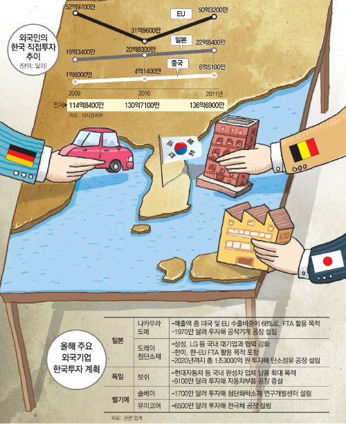 일본의 한국 투자는 이 같은 FTA 효과 외에 지난해 대지진으로 막대한 생산 차질을 빚자 부품·소재기업들을 중심으로 지진 염려가 거의 없고 전기요금도 싼 한국에 생산거점을 두려는 이유도 한몫했다.