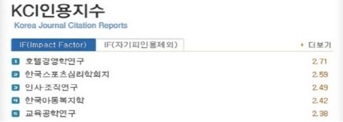 (사)한국호텔외식경영학회(회장 경희대 이수범 교수, 사무국장 경희사이버대 김학준 교수)의 학술지 ‘호텔경영학연구’가 한국연구재단에 등재된 총 2,146개의 학술지 중 한국학술지인용색인(KCI, Korea Citation Index)의 영향력 지수(Impact Factor) 2.71점으로 1위를 차지했다.