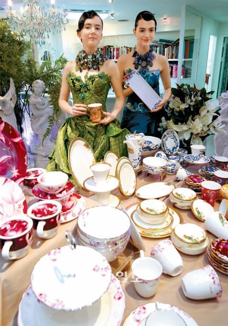 한국도자기가 만든 혼수용 자기들이 19일 서울 강남구 신사동 앙드레김 아뜰리에에 전시돼 있다. 디자이너 앙드레김이 생전에 직접 디자인한 문양들이 자기에 표현돼 화사한 느낌을 준다는 설명이다.