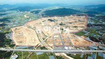 공사가 한창인 경북 김천혁신도시 전경. 붉은색 선 안이 사업지로, 지난달 말 현재 터닦기공사는 95%, 기반시설공사는 77%가 진행됐다. 공공기관 이전이 본격화하면서 혁신도시도 조금씩 모습을 드러내고 있다. 올해 전국 10개 혁신도시에서 아파트 2만3000여채가 분양될 예정이다. 한국토지주택공사(LH) 제공