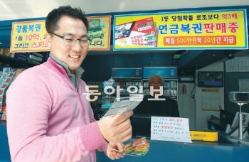 22일 서울 종로구 충신동의 복권전문점에서 한 회사원이 연금복권을 사서 살펴보고 있다. 20년에 걸쳐 당첨금을 나눠주는 지급 방식을 도입한 연금복권은 복권 소비자들로부터 큰 인기를 끌고 있다. 김미옥 기자 salt@donga.com