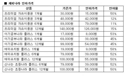 재미나라는 전체 콘텐츠를 이용할 수 있는 프리미엄 자유이용권 1개월 상품을 기존 3만원에서 1만 5천원으로 50%, 신나는 초등나라 플러스 12개월 상품을 50% 인하하는 등 온라인 교육 서비스 가격을 대폭 조정한다.
