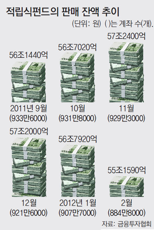 코스피가 두 달째 2,000대 초반에서 옆걸음치고 있는 가운데 펀드 환매 바람이 거세지고 있다. 2월 말 현재 국내외 적립식펀드 판매 잔액은 55조1590억 원으로 전월보다 1조6330억 원 감소하는 등 석 달 연속 내리막길을 걸었다. 같은 기간 펀드 계좌 수도 884만8000개로 22만9000개가 줄었다. 2010년 12월 34만4000개 이후 월간 감소 폭으로는 가장 큰 수치다.