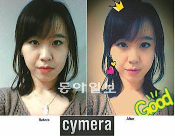 SK커뮤니케이션즈가 지난달 말에 내놓은 카메라 앱 ‘싸이메라’는 출시한 이후 약 열흘 만에 앱 마켓 T스토어의 무료 앱 다운로드 1위로 올라섰다. 싸이메라는 ‘코스메틱 카메라앱’을 간판으로 내세웠다. 성형수술을 한 것 같은 착시를 느낄 정도로 사진을 완벽히 보정해 준다는 것. 간단한 터치로 피부의 잡티를 제거하는 효과뿐 아니라 보톡스, 턱 깎기 등의 기능을 추가해 10, 20대 여성 사용자들에게 인기를 얻고 있다. 파노라마 렌즈와 어안렌즈 등 일곱 가지 촬영렌즈를 지원하고 페이스북이나 트위터 등 소셜네트워크서비스(SNS)를 통해 사진을 공유할 수 있게 했다.