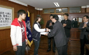 속초 동우대학 전성용 총장은 4월 3일(화) 대학 총장실에서 해당 학과장이 참석한 가운데 2012학년도 입시 경품이벤트 당첨자인 호텔조리과 이준선 학생과 보건행정과 박지혜 학생에게 경품으로 60만원 상당의 아이패드(iPad, 16GB)를 전달했다.