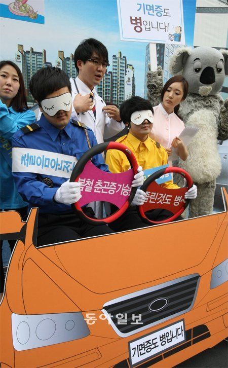JW중외제약이 12일 서울 명동 입구에서 대한수면학회, 대한수면의학회와 공동으로 졸음운전 방지 캠페인을 벌이고 있다. JW중외제약 측은 “봄철 춘곤증으로 인한 졸음운전 사고가 교통사고 사망의 30%를 차지한다”고 설명했다.