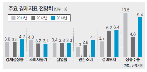 한은은 16일 발표한 ‘2012년 경제전망(수정)’에서 올해 한국 경제의 국내총생산(GDP)이 지난해보다 3.5% 늘어날 것으로 전망했다. 2년 연속 3%대 저성장으로, 전망대로라면 올해는 지난해(3.6%)보다도 낮은 성장률이 나올 것으로 보인다. 한은은 “유럽 국가채무 위기로 인한 불확실성이 완화됐지만 세계 경제성장률이 하향 조정되고 원유 도입가격이 오르면서 하락요인이 커졌다”고 설명했다. 다만 한은은 2013년 성장률은 4.2%로 올해보다는 다소 회복될 것으로 전망했다.