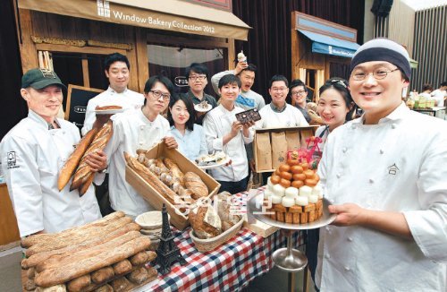 29일 서울 중구 신세계백화점 본점에서 전국의 유명 제과제빵 분야 셰프들이 솜씨를 뽐내는 ‘윈도 베이커리’ 행사가 열렸다. 정웅 셰프(왼쪽) 등 11명의 참가자가 자신의 작품을 들어 보이고 있다.
