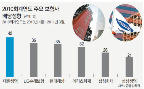 삼성생명은 2011회계연도의 순익이 전년 동기 대비 40% 감소했지만 최근 이사회에서 전년과 같은 주당 2000원의 현금배당을 결정했다. 배당성향은 41.8%에 이른다. 삼성생명이 고배당을 결정하자 6월 정기 주주총회를 앞둔 주요 보험사들도 삼성생명과 비슷한 수준의 배당을 하려는 움직임을 보이고 있다. 한 생보사 관계자는 “어느 정도가 적정선인지 검토하는 단계이지만 삼성생명이 높은 배당을 결정해 (고배당에 대한) 부담이 한결 줄어든 건 사실”이라고 말했다.