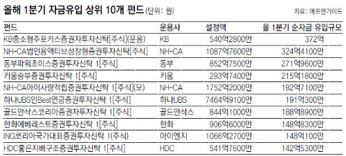 하지만 이런 상황에서도 돈이 더 들어온 펀드들도 있었다. 금융정보업체 에프앤가이드가 올 1분기 자금이 가장 많이 유입된 펀드를 추린 결과, 'KB중소형주포커스증권자투자신탁', 'NH-CA법인용액티브성장형증권투자신탁', '동부파워초이스증권식탁', '키움승부증권투자신탁' 등이 상위에 올랐다. ●'1500억 원 안팎의 작은 몸집'