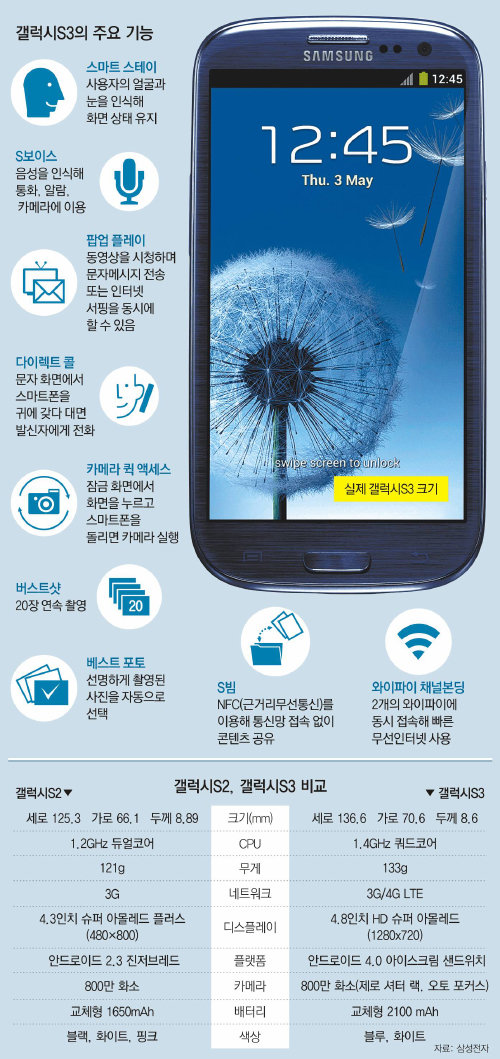 올해 들어 노키아를 제치고 세계 모바일시장 1위로 올라선 삼성전자는 갤럭시S3를 런던 올림픽 공식 스마트폰으로 공급해 아이폰5의 기선을 제압하겠다는 전략을 세웠다. 국내에서는 6월에 판매를 시작할 예정이다.