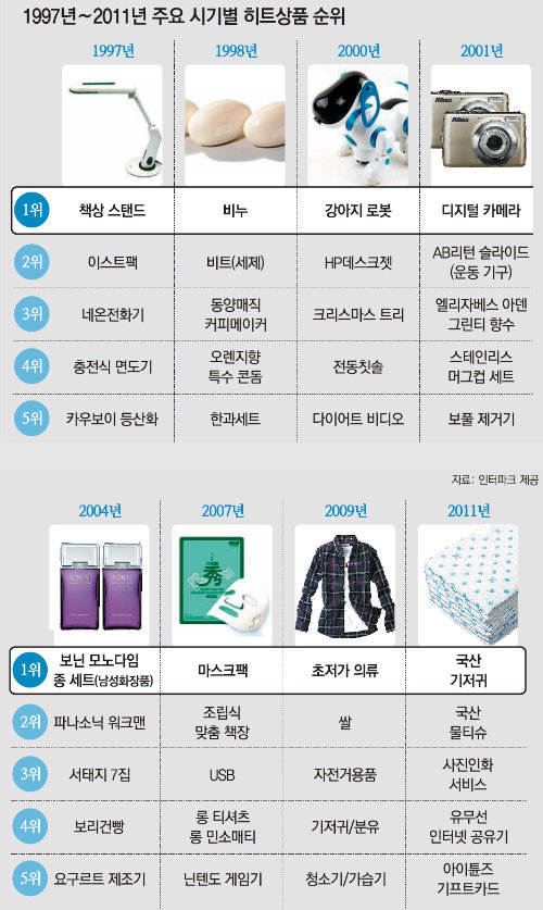 《 히트상품을 보면 사회가 보인다. 국내 첫 종합 온라인몰인 인터파크가 1997년부터 2011년까지 14년 동안의 상품 판매량을 분석한 결과 그 당시의 경제·사회적 상황을 반영하면서 히트상품이 부침을 거듭해온 것으로 나타났다. 1997년의 히트상품은 책상용 스탠드와 학생용 배낭 ‘이스트팩’이었다. 인터넷 쇼핑의 주고객층이 이른바 ‘X세대’로 불리던 젊은 대학생들이다보니 나타난 결과였다. 》 불빛이 들어오는 네온전화기는 판매량 3위에 올랐다. 이는 당시 대학생들의 호주머니 사정상 휴대전화를 갖기 어려웠기 때문으로 보인다.
