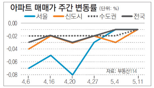정부가 강남 3구의 투기지역 해제를 골자로 하는 ‘5·10 부동산 거래 정상화 방안’을 내놨지만 시장은 좀처럼 깨어날 줄 모르고 있다. 13일 부동산114에 따르면 지난주 아파트 매매시장은 서울(―0.01%)과 1기 신도시(―0.01%), 서울과 1기 신도시를 제외한 수도권(―0.01%) 모두 약보합세를 보였다. 서울은 잠실주공 5단지의 일부 매물이 거래되며 송파(0.05%)만 가격이 올랐을 뿐 중랑(―0.07%) 강동(―0.06%) 동대문(―0.05%) 등 대부분 지역이 하락했다. 신도시는 거래 침체로 매물이 쌓이며 평촌(―0.04%)과 분당(―0.01%) 등이 하락세였다. 중대형 아파트를 중심으로 가격이 조정된 수원(―0.04%)과 김포(―0.03%)도 하락세를 면하지 못했다.
