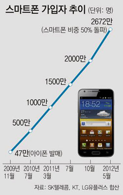 14일 SK텔레콤과 KT, LG유플러스에 따르면 11일 기준으로 국내 휴대전화 가입자는 5255만 명이며, 이 가운데 50.8%인 2672만 명이 스마트폰 가입자인 것으로 집계됐다. 이는 2009년 11월 애플의 ‘아이폰’이 국내에서 팔리기 시작하면서 스마트폰 열풍이 불기 시작한 지 약 2년 반 만의 일이다.