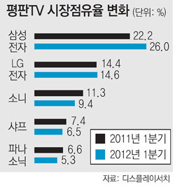 삼성전자는 평판 TV 분야에서도 점유율을 늘려 지난해 1분기보다 3.8%포인트 증가한 26%를 나타냈다. LG전자의 점유율도 14.6%로 지난해 같은 기간보다 소폭 증가해 프리미엄 TV 시장에서 국내 업체들이 강세를 보였다. TV 시장의 규모는 줄었지만 평판 TV 중에서도 3차원(3D) TV의 성장세는 지속됐다. 3D TV는 지난해 한 해 동안에만 2000만 대 넘게 팔려나가며 폭발적인 인기를 끌었다. 이는 2010년 전체 판매량의 10배 수준으로 가벼워진 3D TV 전용 안경과 다양해진 콘텐츠로 올해 1분기에도 성장세를 이어갔다.