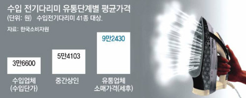 조사 결과, 국내 수입업체는 41종의 전기다리미를 평균 3만6600원에 들여오고, 이를 중간상인이나 소매업체에 평균 5만4103원에 팔고, 최종적으로 백화점과 대형마트는 수입다리미를 평균 9만2430원(부가세 포함)에 판매하는 것으로 나타났다.