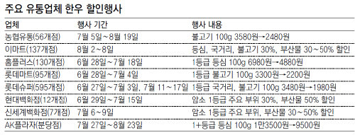 백화점, 대형마트, 슈퍼마켓뿐 아니라 온라인 오픈마켓, 소셜커머스까지 참여하는 대대적인 한우 할인행사가 진행된다. 한우협회와 한우자조금관리위원회는 3일 유통업체들과 함께 7, 8월 한우 할인판매를 한다고 밝혔다.