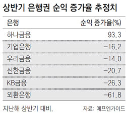 3일 금융정보업체 에프엔가이드에 따르면 증권사들은 4대 금융지주사(하나 신한 우리 KB)와 IBK기업, 외환은행 등 6개사의 상반기 순이익 합계를 6조7957억 원으로 추산했다. 이는 지난해 상반기(7조9542억 원)에 비해 1조1500억 원 이상 줄어든 것이다.