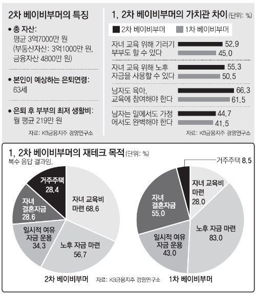 같은 질문에 대한 1차 베이비부머의 응답률(50.5%)보다도 높다. 2차 베이비부머의 재테크 목적 역시 자녀 교육이 1순위였다. 응답자들의 재테크 목적은 교육비가 68.6%(복수응답)로 1위였고, 노후자금 마련(56.7%), 일시적 여유자금 운용(34.3%)이 뒤를 이었다. 1차 베이비부머의 재테크 목적이 노후자금 마련(83.0%)과 자녀 결혼자금(55.0%)인 것과는 대조적이다.