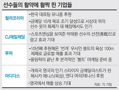 휠라코리아 관계자는 “선수용 유니폼은 한정된 수량만 만드는데 인기 사이즈는 이미 품절됐다”며 “바캉스 시즌인 7월 말∼8월 초는 비수기인데 올해는 스포츠 열풍으로 올림픽 시작 전과 비교해 매출이 품목별로 5∼10% 늘었다”고 말했다.