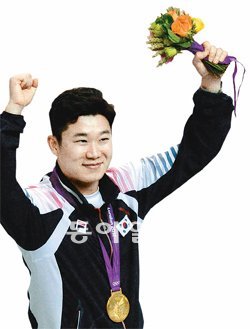 2012 런던 올림픽 2관왕에 오른 사격의 진종오 선수가 환호하고 있다. 선수들의 유니폼을 디자인한 휠라코리아는 “한국의 금빛 물결로 글로벌 광고효과를 톡톡히 보고 있다”고 설명했다. 동아일보DB
