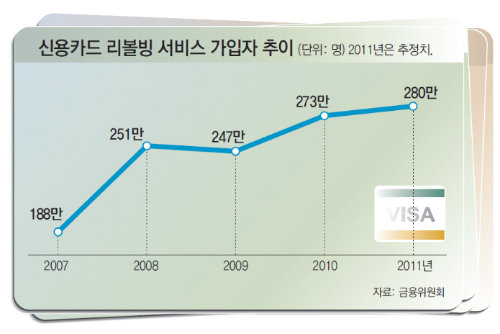 문제는 리볼빙 서비스 가입자의 35.7%(100만 명)가 신용등급 7등급 이하의 저신용자라는 점이다. 여기에 카드사들은 리볼빙 서비스 수수료로 연간 20∼30%에 이르는 높은 금리를 부과한다. 이 때문에 리볼빙 서비스를 이용하는 일부 저신용층은 불황으로 소득이 줄어든 데다 눈덩이처럼 불어난 리볼빙 수수료 부담을 감당하기 힘든 상황이다.