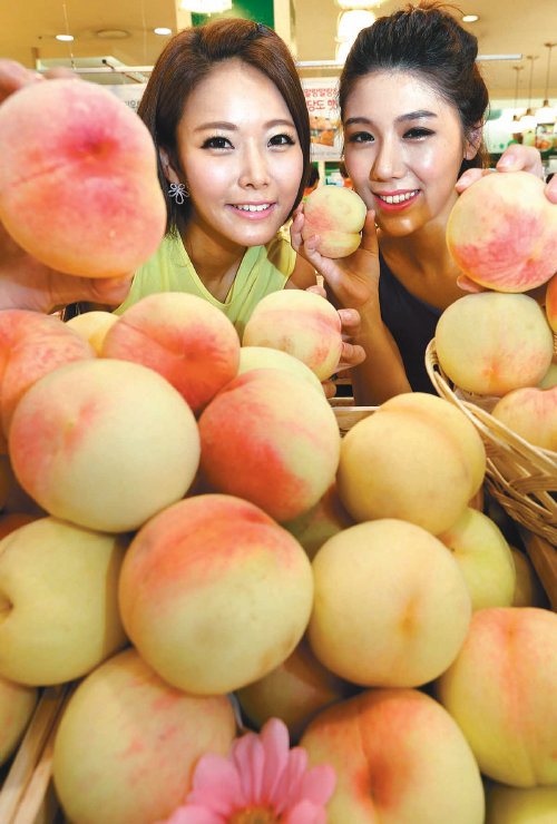 12일 롯데마트 서울역점에서 모델들이 햇사레 복숭아를 선보이고 있다. 올해는 폭염으로 출하시기가 예년보다 일주일가량 빨라졌다. 롯데마트는 5∼8개들이 한 상자를 시세보다 20% 저렴한 1만2500원에 판매한다.