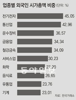 올 들어 10조7069억 원어치를 순매수한 외국인이 가장 많이 사들인 업종은 전기전자와 통신업종이었다. 외국인 비중은 전기전자업종에서 45.05%, 통신업종에서는 42.96%였다. 이어 운수장비(36.57%), 금융업(34.34%), 철강금속(34.09%), 서비스업(30.23%) 등의 순이었다. 외국인이 주로 많이 내다 판 업종은 의료정밀업으로 외국인 비중이 지난해 말 4.67%에서 13일 현재 2.47%로 감소했다.